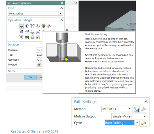 功能:? 新的背面埋頭孔加工工序子類型? 新的單個運動鉆孔循環類型益處:? 從背面加工倒角的專用工序