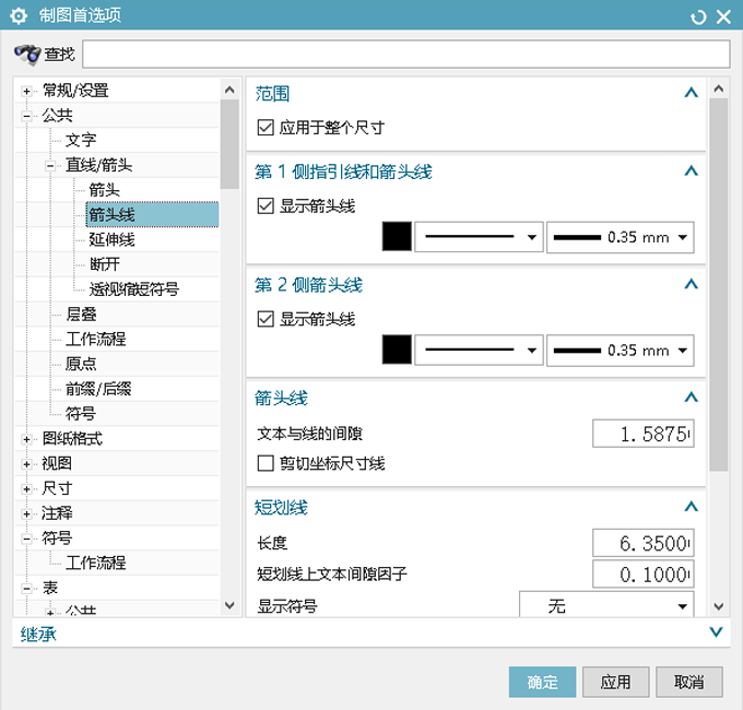 1、點擊:菜單→首選項→制圖,然后選擇:公共→直線/箭頭→箭頭線。