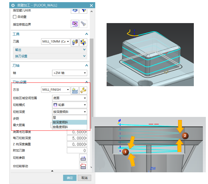 底壁切削,輪廓切削模式,切削深度兩種選擇。