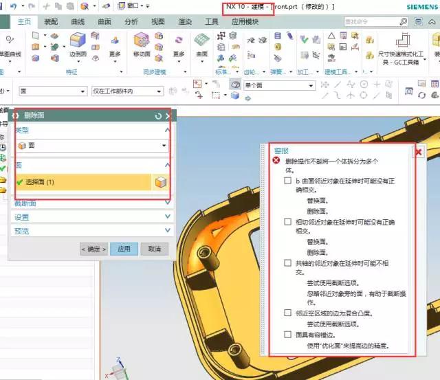 很多朋友都在修模的時(shí)候遇到過這樣的問題,就是當(dāng)你使用同步建模的時(shí)候,用刪除面的時(shí)候,選擇一個(gè)面刪除,會(huì)出現(xiàn)報(bào)警。這個(gè)是因?yàn)槟氵x擇要?jiǎng)h除的面與其他面之間存在一定的關(guān)聯(lián),你刪除這個(gè)面后無(wú)法計(jì)算,所有就會(huì)出現(xiàn)報(bào)警的情況。