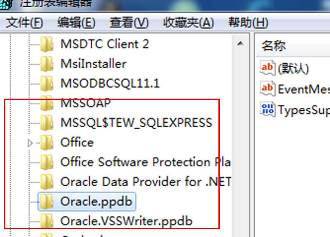 5、運行refedit,HKEY_LOCAL_MACHINESYSTEMCurrentControlSetServicesEventlogApplication, 刪除所有Oracle入口。